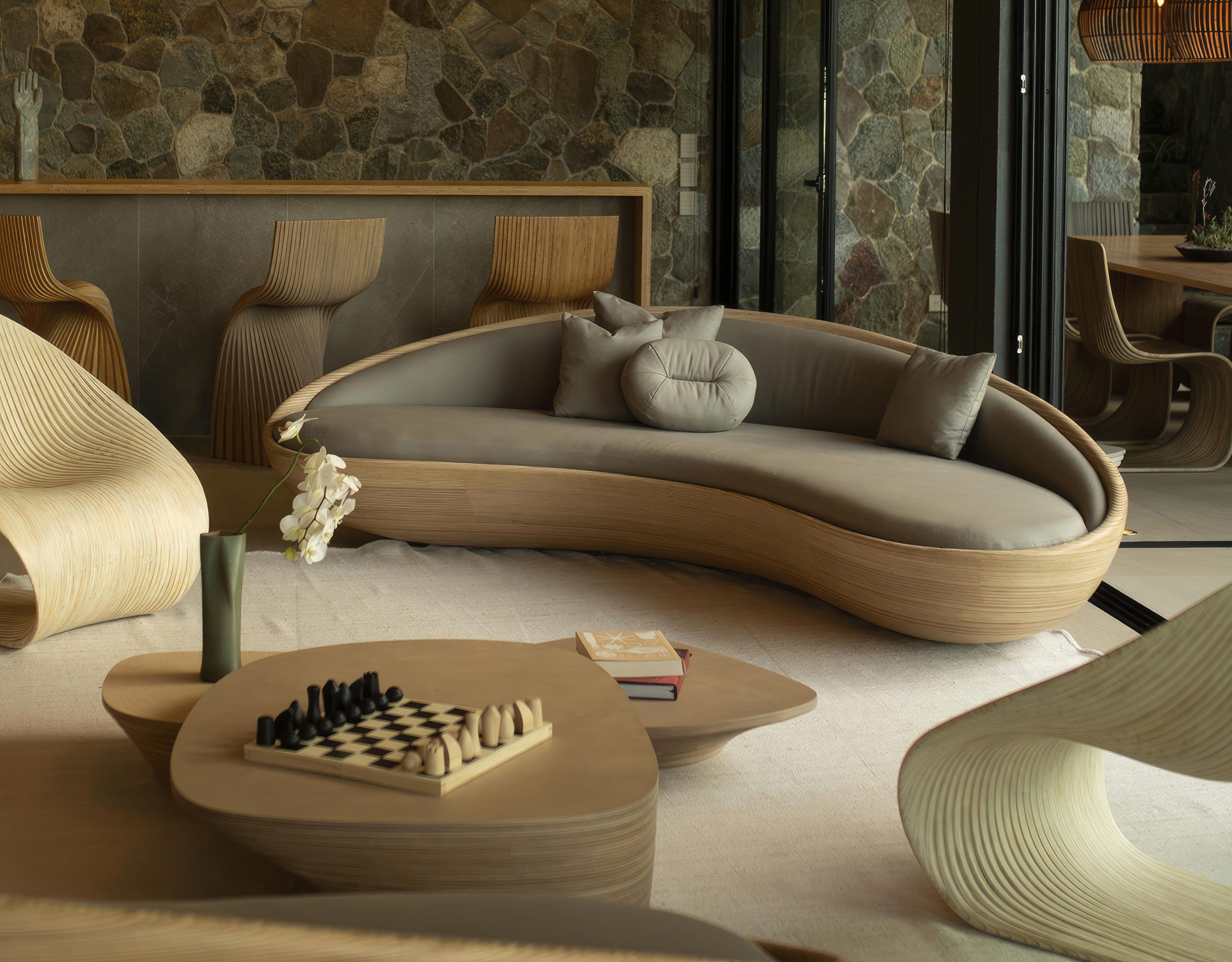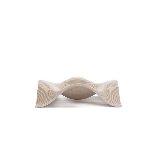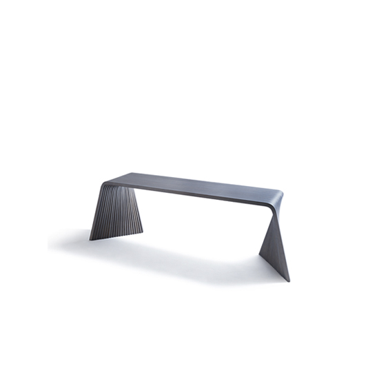 Sofa made with horizontal sections of laminated birch and spruce wood (18.5 mm thickness each). Matt finish with stain and exterior polyurethane coating